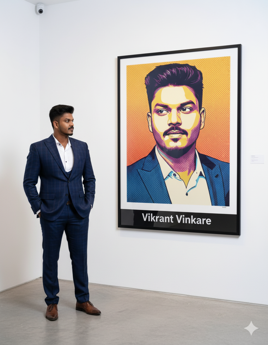 A hyper-realistic 8K full-body portrait captures a stylish South Asian man, whose facial features are identical to those in , standing casually in a pristine, modern white art gallery. He is dressed in the same blue plaid suit, white shirt, and dark trousers as seen in , with his hands casually in his pockets. To his right, a colossal, floor-to-ceiling framed pop-art style vector portrait of himself dominates the wall. This large artwork features bold, flat colors, graphic lines, and a halftone dot pattern, depicting his likeness in a vibrant, stylized manner. Mounted on the bottom center of the frame is a sleek, black metallic nameplate with the text ‘Vikrant Vinkare’ rendered in large, elegant white letters. The gallery space is minimalist, with clean, white walls, a polished concrete floor, and no other distractions. Soft, diffused ambient light from hidden sources illuminates the scene evenly, highlighting the textures of his suit and the glossy finish of the framed art. The composition is balanced and elegant, emphasizing a premium creative branding aesthetic. The man stands with a confident yet relaxed posture, looking towards his own pop-art portrait with a subtle, proud expression.