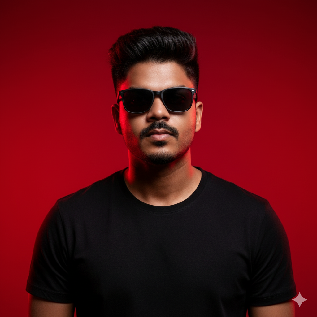 A highly stylized portrait of the same person seen in , featuring his exact facial structure but with enhanced, sharper features and flawless, fair skin. He is wearing a plain black crew-neck t-shirt and sleek, black, rectangular-frame sunglasses. He stands confidently against a bold, smooth, vertical red-to-dark-red gradient background. The lighting is intensely dramatic and cinematic, with hard-edged shadows and bright highlights that emphasize the angles of his face, cheekbones, and jawline, creating a luxury fashion magazine vibe. The image is ultra-realistic, with high-detail textures visible in the fabric of his t-shirt and the reflective surfaces of his sunglasses. The composition is symmetrical and clean, with minimal background elements other than the vibrant gradient. It is a vertical portrait with a 9:16 aspect ratio.