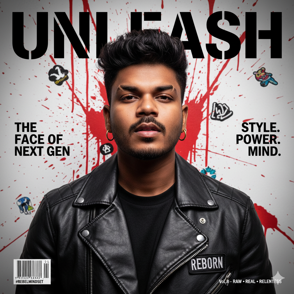 A highly detailed, ultra-realistic magazine cover design with a strong, vibrant aesthetic. At the center is a striking frontal portrait of the young man from , with his exact facial features, biting his lip slightly. His disheveled, textured hair is styled upwards. He wears a black leather jacket with a prominent, embroidered ‘REBORN’ patch on the chest, and several gold hoop earrings in his ears. The background is a stark white wall dynamically streaked with bold, splatters of red paint and various edgy streetwear-style sticker graphics, including abstract shapes and small icons. The magazine title ‘UNLEASH’ is rendered in a large, bold, black stencil font across the top center. To the left of the main portrait, the vertical cover lines read ‘THE FACE OF NEXT GEN’ in a clean, white sans-serif font. To the right, also vertically, are the cover lines ‘STYLE. POWER. MIND.’ in a similar font. At the bottom left, there is a black and white barcode graphic and the hashtag ‘#REBELMINDSET’. At the bottom right, in smaller text, reads ‘Vol. 8 – RAW • REAL • RELENTLESS’. The lighting is dramatic and cinematic, creating deep shadows that emphasize the contours of his face, the texture of the leather jacket, and the individual strands of his hair. The skin texture is incredibly detailed, showing pores and natural imperfections. The overall feel is that of a luxury streetwear editorial, with a hyper-photorealistic finish. A subtle vignette darkens the edges of the frame. The aspect ratio is 9:16.