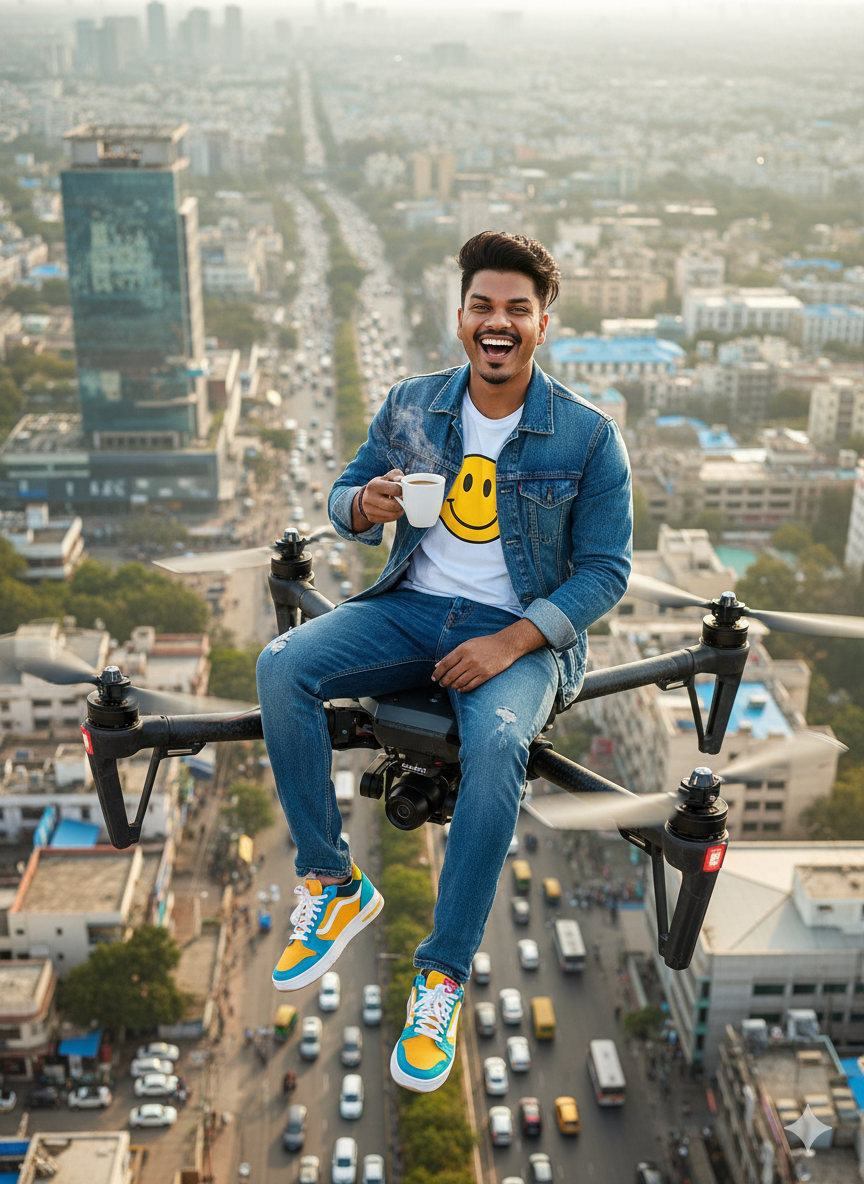 A stunning, ultra-realistic digital art photograph captures the man from in a dynamic, full-body vertical composition. He is seated casually on a large, futuristic, multi-rotor flying drone, with his legs dangling freely and bent at the knees, wearing bright-colored thick skate sneakers with mismatched laces. He has a joyful, open-mouthed laugh, looking directly into the camera lens while holding a steaming, white ceramic mug of coffee in his right hand. He wears a plain white cotton t-shirt featuring a yellow smiley face emoji, layered under a classic blue denim jacket with rolled-up sleeves and slim-fit, distressed blue jeans. The drone hovers high above a sprawling, bustling Indian urban cityscape, filled with modern glass buildings interspersed with traditional architecture, and a network of congested roads with cars, buses, and tuk-tuks. The scene is illuminated by soft, natural morning sunlight, which creates gentle highlights and shadows on his skin, the texture of his disheveled dark hair, the worn fabric of his denim jacket, the creases in his jeans, and the steam rising from the coffee. The aerial perspective is dramatic, emphasizing the scale of the city below and the sense of freedom and exhilaration. The framing is balanced, with a shallow depth of field, keeping the man and the drone in sharp focus while the urban background is softly blurred.