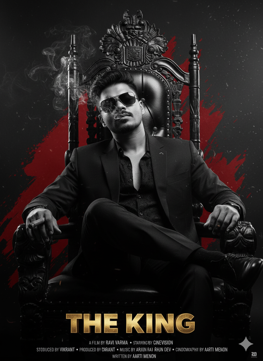 A cinematic movie poster in ultra-detailed, photorealistic, high-contrast black and white with striking red accents, featuring the man from . He sits confidently on an ornate, luxurious black leather throne chair, leaning slightly back, exuding a powerful and commanding presence. He wears dark, stylish sunglasses, a black patterned open-collar shirt, and a tailored black suit. Wisps of smoke curl dramatically from a cigar he holds in his hand. The lighting is harsh and directional, creating deep, moody shadows that sculpt his sharp facial features and the intricate details of the throne and his attire. Bold, abstract, brush-stroke-like graphic elements in deep red splash around the edges of the composition, giving a chaotic energy. Dust and fine particles float visibly in the atmosphere, catching the light and creating a gritty, cinematic feel. At the very bottom center, the movie title logo “THE KING” is rendered in large, textured, glossy metallic gold 3D block letters. Below it, in small, white, condensed font, are realistic film credits: “A FILM BY RAVI Varma • STARRING VIKRANT • PRODUCED BY CineVision • MUSIC BY ARJUN Rai • CINEMATOGRAPHY BY Rahul Dev • WRITTEN BY Aarti Menon.” The overall image is a high-resolution poster design with an epic cinematic atmosphere, 1024×1536 resolution.