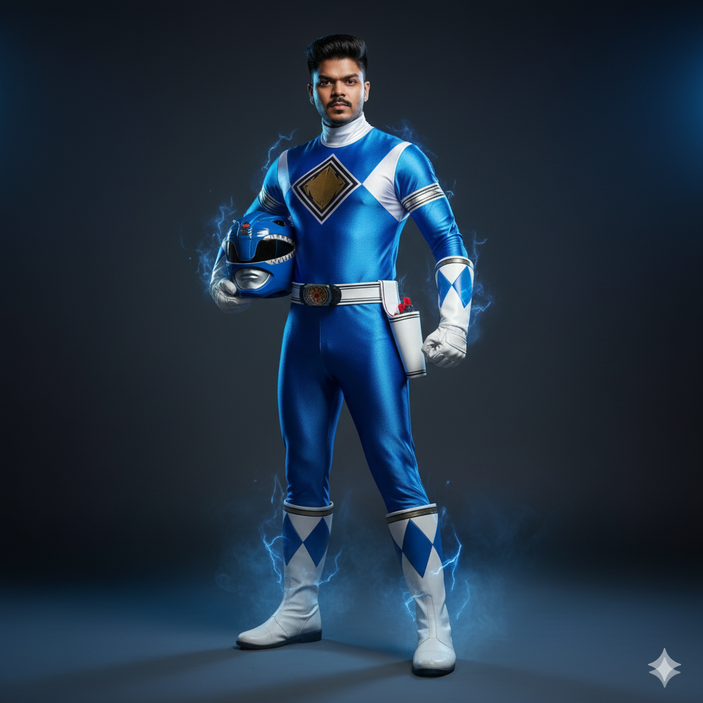 A young man dressed as a superhero in a shiny blue costume with white diamond patterns, standing confidently while holding a matching blue helmet in one hand. The background is dark with glowing blue energy effects around him, giving a powerful and cinematic look.