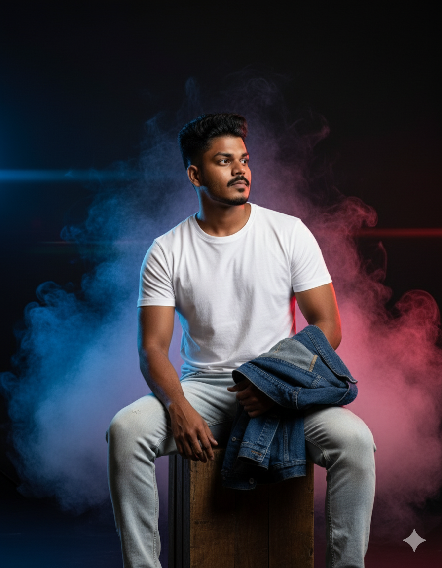 Based on the person depicted in , the scene is transformed into a bright studio setting. The young man now features wavy, vintage-style hair that is clean-cut. He is dressed casually in a plain white crew-neck t-shirt and light-colored, slightly faded denim jeans. Instead of the office chair, he is sitting comfortably sideways on a rustic wooden crate, resting his right elbow on his raised knee. He is looking off towards the right side of the frame with a relaxed expression. In his left hand, which rests near his lap, he holds a folded dark blue denim jacket. The background is a studio backdrop with dramatic lighting effects; swirling clouds of smoke in cool blue and fiery red hues blend together against a stark, brightly lit black void. There are subtle lens flares and atmospheric light beams cutting through the smoke. The overall mood is casual yet stylish, with sharp focus on the man and his clothing, contrasting against the blurred, colorful smoke backdrop.