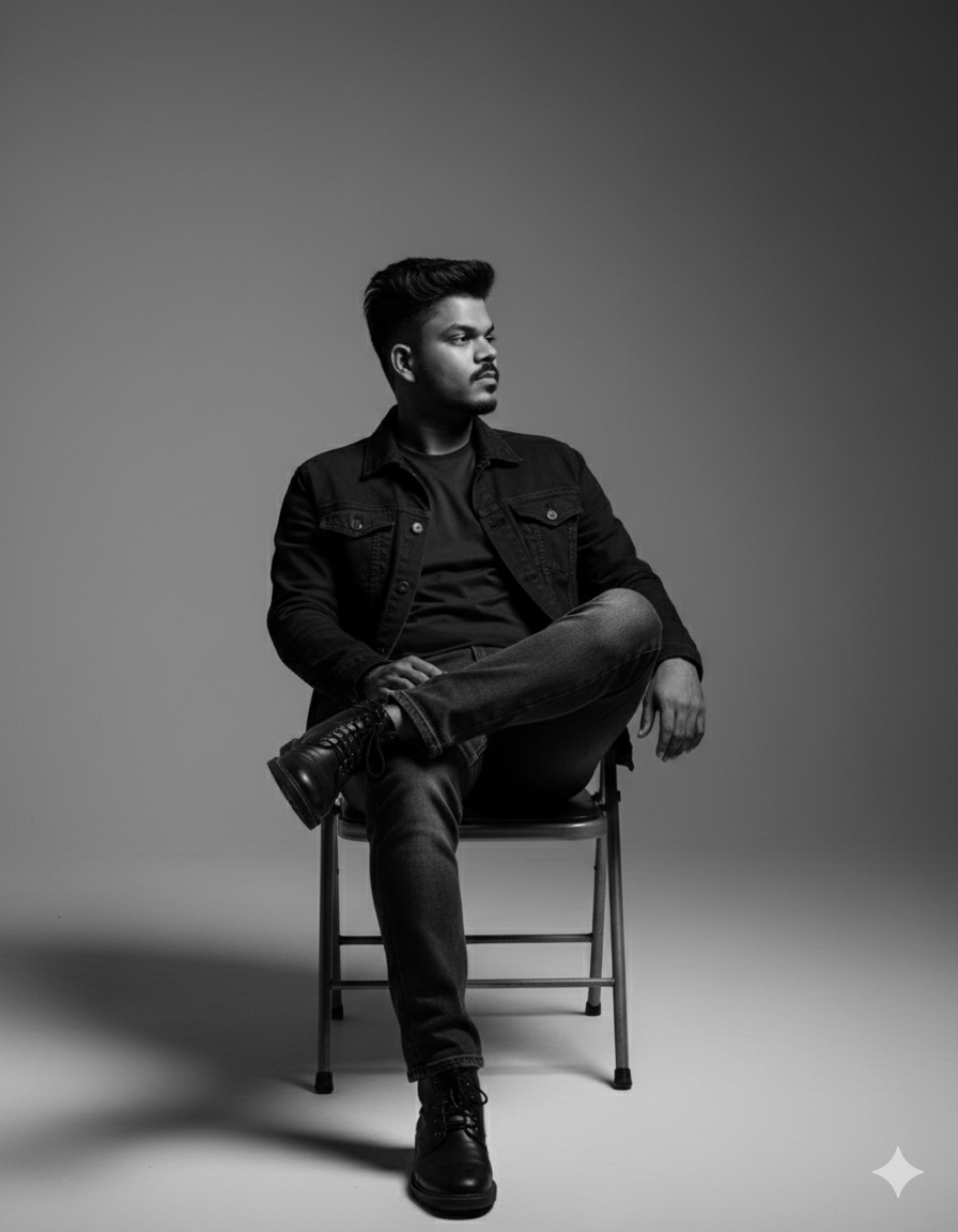 A black-and-white studio photograph featuring the young man from . He is sitting casually on a simple, metal folding chair, with his right leg crossed over his left. He wears a dark denim jacket over a plain dark t-shirt, paired with straight-cut dark jeans and black lace-up boots. His body is relaxed, leaning slightly back in the chair, with his left hand resting on the chair’s metal armrest. His face is turned to his right side, looking off-camera. The lighting is soft and minimal, characteristic of a studio setting, creating dramatic, sharp shadows that emphasize the contours of his face, the folds in his clothes, and the form of the chair, contributing to a moody atmosphere. The background is a plain, solid grey studio backdrop, with a subtle gradient, providing a clean and modern aesthetic. The image has a cinematic, high-contrast look, focusing entirely on the subject and the interplay of light and shadow.