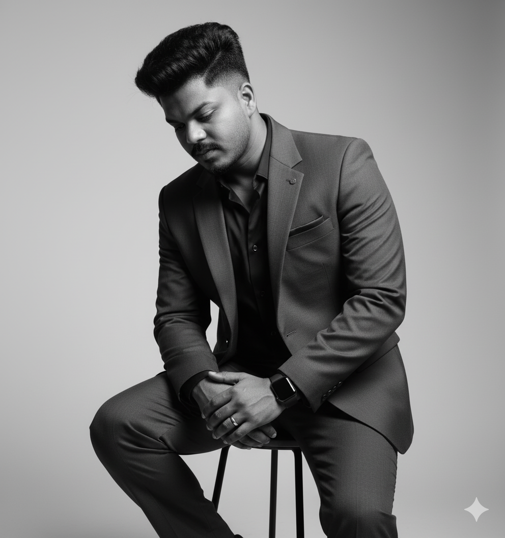 A black and white artistic studio portrait, featuring the man from , maintaining his exact facial features and hairstyle. He is dressed in a sophisticated, impeccably tailored suit, including a jacket, trousers, and a dark shirt underneath, with a pocket square. He is sitting on a simple, modern stool with a slightly hunched posture, his head tilted down as if deep in thought, looking towards the floor. His hands are clasped loosely in his lap. He wears a sleek, minimalist wristwatch and a subtle ring on his finger as the only accessories. The studio lighting is clean and dramatic, creating a strong sense of texture and depth, with deep shadows defining the creases of his suit and the contours of his face, while bright highlights emphasize the texture of his hair and the fabric. The background is a plain, light grey gradient, giving the image an elegant and editorial couture feel. The composition is tight, focusing on his pensive expression and the high fashion aesthetic. The photo is in portrait orientation.