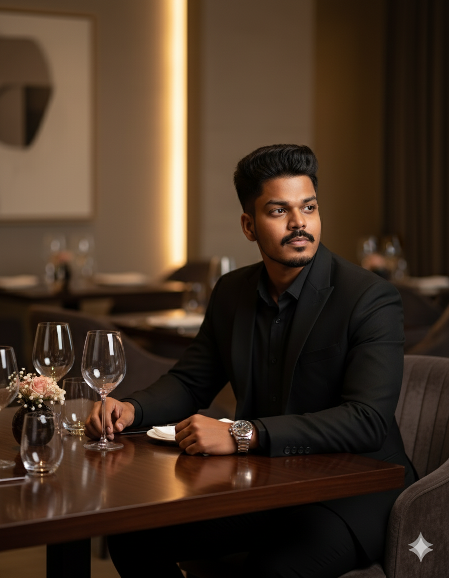 A hyper-realistic, cinematic, and stylish photograph captures a man, whose exact facial features, mustache, and hairstyle are identical to those in , sitting at a magnificent, dark wood fine-dining table. He is dressed in an impeccable all-black suit with a black dress shirt and no tie. A sleek, polished silver wristwatch with a metal band is prominently visible on his left wrist, resting near the table’s edge. His pose is relaxed but confident, with one arm casually placed on the table, and he looks slightly off-camera to the right with a sophisticated expression. The setting is a high-end, modern restaurant lounge, with soft, ambient lighting emanating from hidden sources, creating warm glows on polished surfaces. On the table, crystal wine glasses sparkle, a small, delicate floral centerpiece in a dark vase adds a touch of nature, and the surface itself reflects a subtle gleam. Other tables are visible but softly out of focus in the background, along with plush velvet chairs and minimalist, elegant wall art. The atmosphere is quiet, refined, and luxurious, with a warm, low-key lighting scheme that casts gentle shadows and highlights textures, contributing to a classy and exclusive mood.