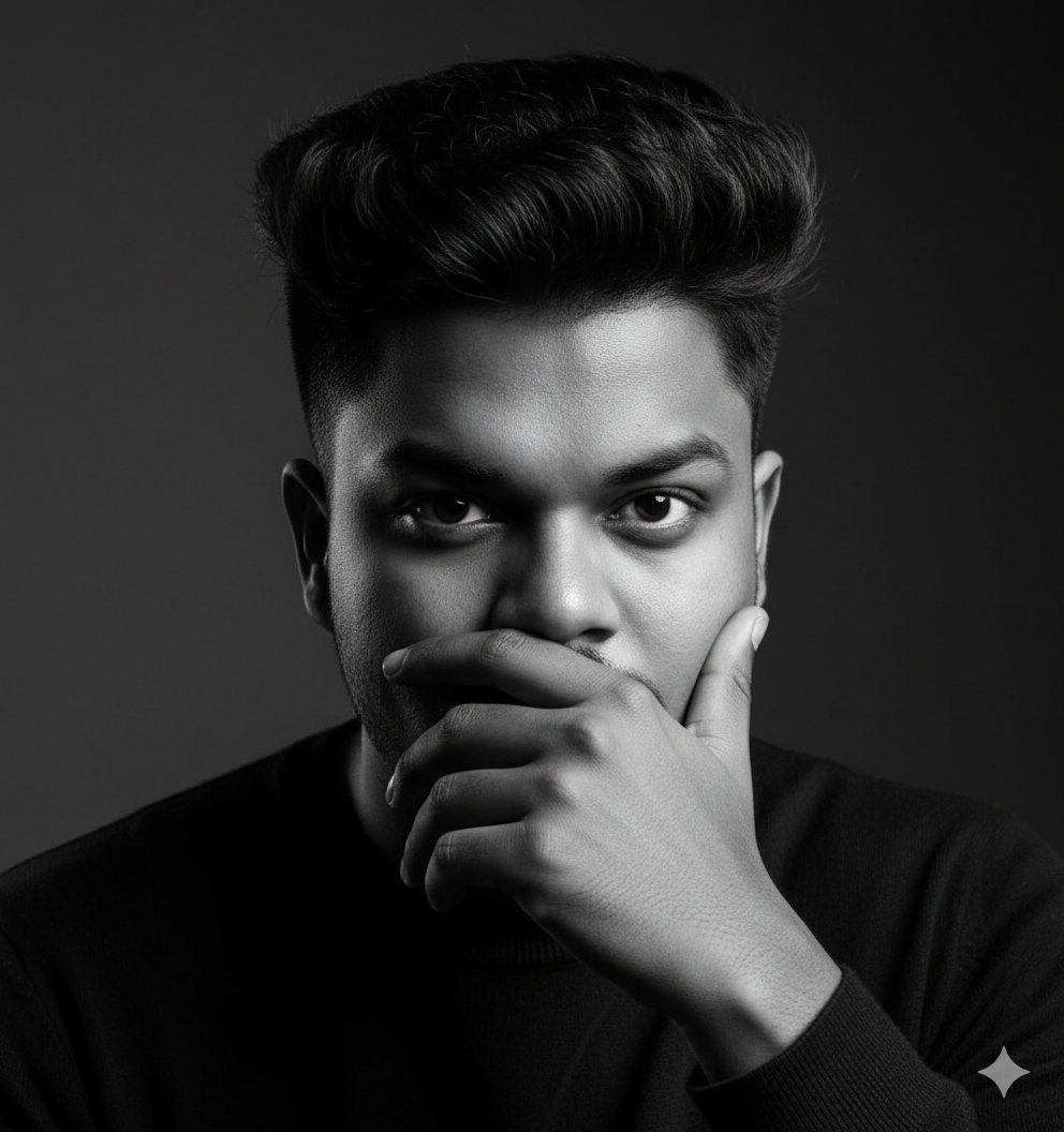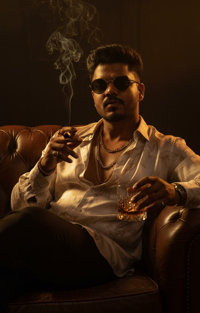 A hyper-realistic cinematic low-light portrait of a stylish South Asian man, whose facial features, beard, and mustache are based on . He is lounging comfortably and confidently on a deep brown, vintage tufted leather couch. He wears a flowing, open-button silk shirt with a subtle pattern, revealing layered gold and silver chain necklaces on his chest. Large, dark-lensed round sunglasses obscure his eyes, adding to his mysterious aura. In one hand, he holds a lit cigar with a trail of smoke curling upwards, and in the other, he cradles a heavy crystal glass filled with amber-colored whiskey and a single large ice cube. The scene is bathed in warm, dramatic golden light from a hidden source, casting long, deep cinematic shadows that sculpt his features and the texture of the couch. The smoke from the cigar catches the golden light, creating glowing, atmospheric trails around him. The background is extremely dark and moody, consisting of out-of-focus, indistinct shapes and rich, deep shadows, making the man the sole focal point. His expression is confident and poised, exuding a palpable sense of power and calm authority. The entire scene has an ultra-detailed, 8K, high-quality photograph feel with incredible texture fidelity.
