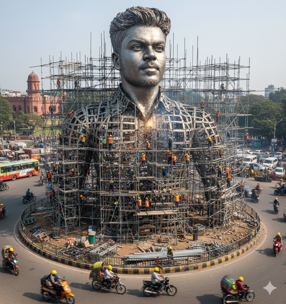 A hyper-realistic, wide-angle photograph capturing a massive, unfinished statue of a man in the middle of a bustling roundabout in Dhaka, Bangladesh. The statue’s face, exactly identical to the man’s face in , is the only fully sculpted and visible part, gazing confidently into the distance. The rest of the colossal figure is a rough, metallic framework, completely encased in a dense network of aluminum scaffolding. Dozens of construction workers in bright yellow hard hats, orange safety vests, and work boots are climbing the structure, welding sparks flying in golden arcs, carrying materials, and fastening beams. Below, the roundabout is filled with a chaotic mix of colorful rickshaws, cars, buses, and motorbikes, with blurred motion trails suggesting movement. In the background, a famous historical landmark, like the Lalbagh Fort or Ahsan Manzil, is partially visible, contrasting with the modern construction. The ground around the statue’s base is cluttered with building materials, wooden planks, tools, and metal parts. The lighting is bright daylight, casting sharp, realistic shadows and highlighting the metallic textures, dust in the air, and the details on the workers’ faces and clothing. The entire scene is captured with the quality of a professional documentary photograph.