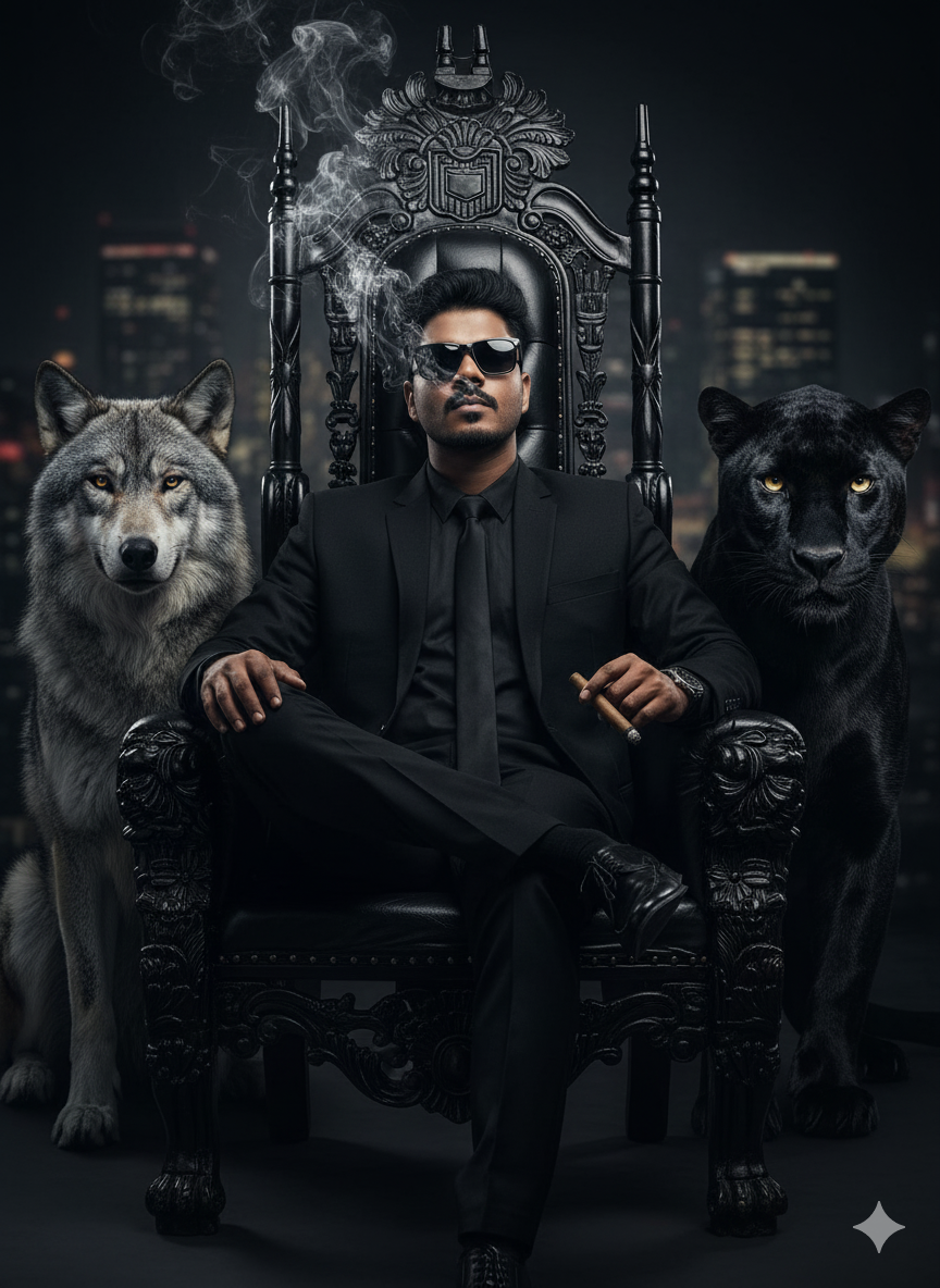 A cinematic portrait of a confident man sitting on a luxurious black leather throne chair, dressed in an elegant black suit and sunglasses, exuding power and authority. He holds a cigar with smoke swirling upward. On his left side sits a majestic wolf with sharp eyes, and on his right side stands a sleek black panther with glowing eyes. The background is a dark, moody city skyline blurred out, dramatic lighting with strong shadows, ultra-detailed, high contrast, photorealistic, 8k resolution, dark cinematic atmosphere.